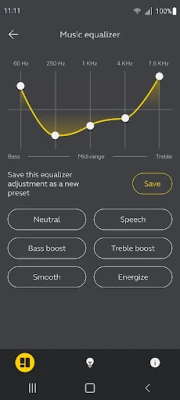 انغمس في عالم الموسيقى بجودة لا تضاهى، فبواسطة معادل الصوت خماسي النطاقات، يمكنك ضبط كل تفصيلة في نغماتك المفضلة، الاختيار بين الإعدادات المسبقة الاحترافية أو ابتكار توقيعك الصوتي الخاص. ولعشاق الموسيقى، يتيح لك التطبيق إعداد Spotify Tap للوصول السريع والفوري إلى مكتبتك الصوتية. كما يضمن لك تواصلًا لا تشوبه شائبة، حيث يمكنك تخصيص إعدادات المكالمات لتجربة محادثات غاية في الوضوح والنقاء. ليس هذا فحسب، بل يضع بين يديك سهولة الوصول إلى مساعد Google أو Alexa بلمسة واحدة، لتحكم صوتي فائق في مهامك اليومية.