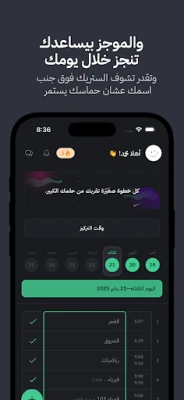 لن تفوتك أي محاضرة أو موعد تسليم مجدداً بفضل الجدول الدراسي البديهي في خطة، الذي يعرض لك مهامك بوضوح على أساس أسبوعي ويومي، مع تذكيرات ذكية تسبق كل حدث. عزز تركيزك باستخدام مؤقت بومودورو المدمج، وقم بإدارة واجباتك ومهامك اليومية بكفاءة عالية، مرتبة حسب الأولوية ومفلترة حسب المقرر أو التاريخ. ولا يقتصر الأمر على الدراسة فحسب؛ حيث يساعدك خطة على بناء عادات إيجابية وتتبع تقدمك نحو تحقيق أهدافك، مع وضع للتركيز يحجب المشتتات ويسمح لك بالانغماس الكلي في مذاكرتك.